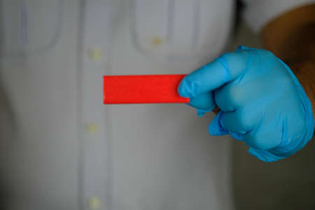 Man wearing blue gloves holds empty a wooden red stick for your text.