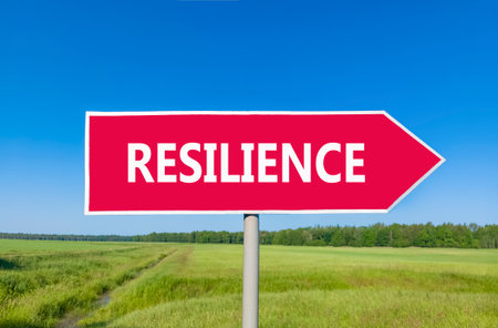 Resilience symbol. Concept word Resilience on beautiful red road sign. Beautiful blue sky green grass and forest peaceful nature background. Business resilience concept. Copy space.