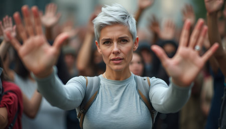A determined woman with short silver hair stands at the forefront of a crowd, raising her hands in a powerful gesture of peace and solidarity. Her expression conveys strength and resolve, symbolizing the fight for justice and equality amidst a sea of raised hands in support.