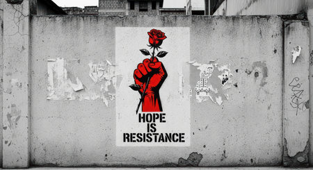 Red fist holding rose street art mural on urban wall