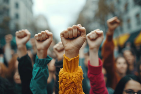 Protestors fists raised up in the air. In a powerful display of dissent, hands form clenched fists, embodying the spirit of resilience and resistance. A peaceful protest for a better world.