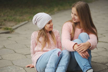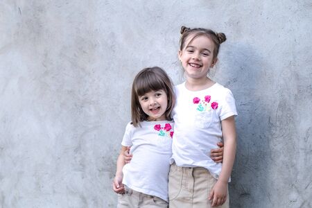 Cute little girls hugging. Sisters and best friends.