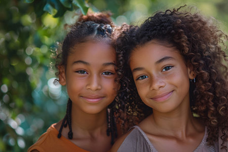 Two young African American girls with beautiful curly hair and warm smiles enjoy a sunny day outdoors, surrounded by vibrant greenery.