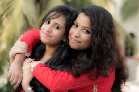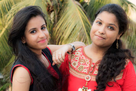 Portrait of two young beautiful indian or south asian teenage girls in dress.