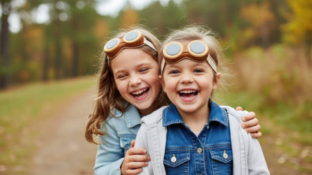Two young girls are depicted smiling and embracing outdoors. They wear goggles and appear happy. The scene is bathed in natural light, with a blurred background suggesting an outdoor environment with trees. This image could be used for various commercial or editorial purposes.