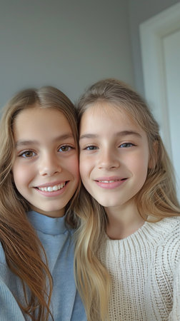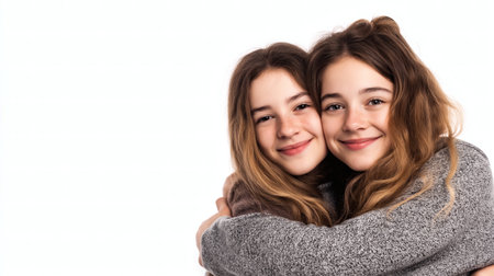 Heartwarming portrait of two young girls embracing with joyful smiles against a clean white background. Perfect representation of sisterhood, friendship, love, and happiness ideal for family, lifestyle, or emotional connection-themed content.