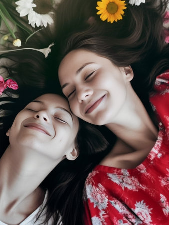 Two Young Girls Embracing in a Warm Hug Amongst Wildflowers A Moment of Friendship and Affection Captured in the Beauty of Nature AI Generative