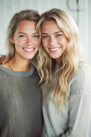 Two young women with blonde hair share joyful smiles, showcasing their natural beauty and happiness while standing close together indoors, bathed in soft, warm natural light.