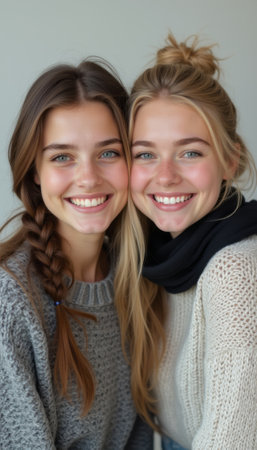 Two radiant friends with golden hair and striking blue eyes share a joyful moment captured in gentle sunlight, creating a warm, approachable vibe.