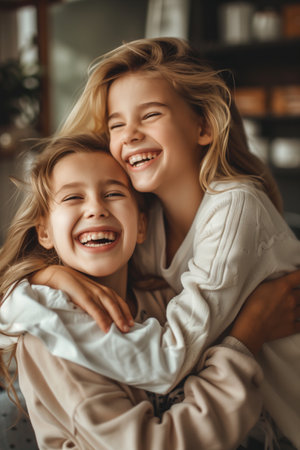 A Heartwarming Candid Moment of a Mother Embracing Her Daughter in a Cozy Home Setting Together.