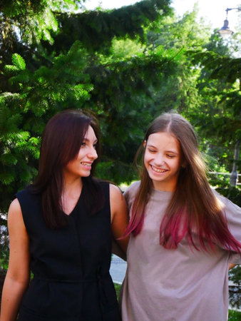 Young mother and daughter are having fun on a walk on a sunny warm day. Joyful emotions.
