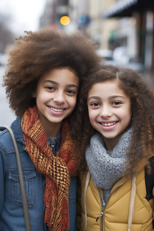 Portrait of two young multiracial girls with curly hair, looking at camera and smiling.