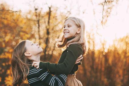 Two happy girls sisters laughing, having fun and playing in the fall in nature outdoors in the autumn park