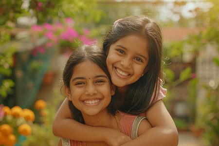 indian sister giving piggyback ride to her younger sister bokeh style background