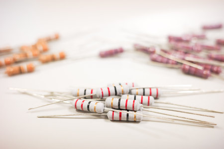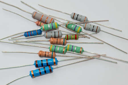 Electronic beige resistors with colored bands on neutral background