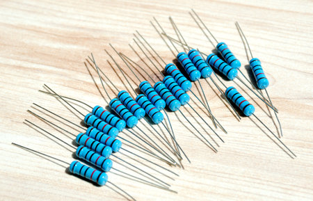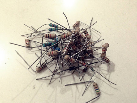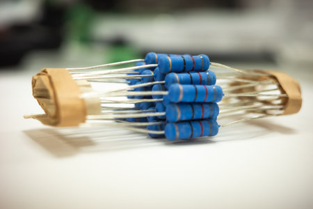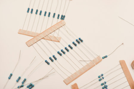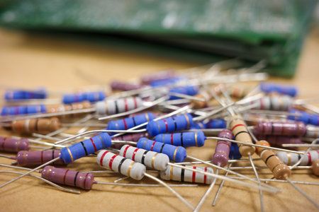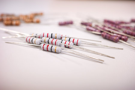 Colorful electronic resistors on a workbench close-up