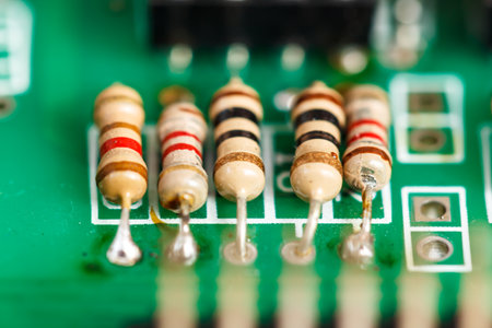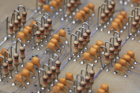 Electronics components resistors on board electrical circuits close-up