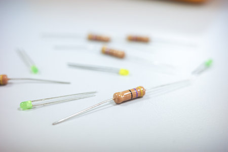 Close-up of electronic components on a white surface, including resistors and LEDs