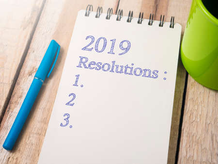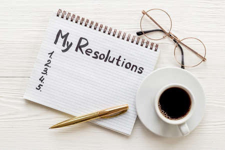 Phrase New Year's resolutions in the notebook. Female hand with pen and cup of coffee