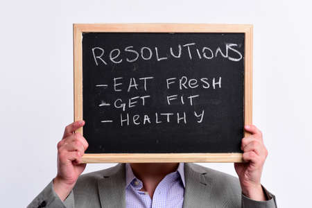 Male hands hold blackboard with sign pointing healthy lifestyle resolutions