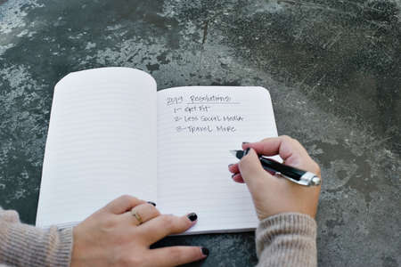 Woman hands writing New Years resolutions for 2019 in a journal