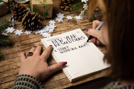 Writing New Year`s Resolutions for Christmas. Christmas Resolutions. Text New Year`s Resolutions on paper.