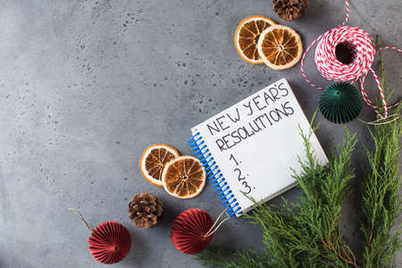 The word New Years resolution, written in a white notebook on a gray New Years background. Copy space.