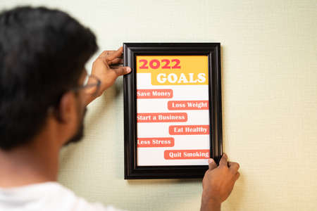 Shoulder shot of young man placing 2022 goals on wall - Concept of new year goal setting