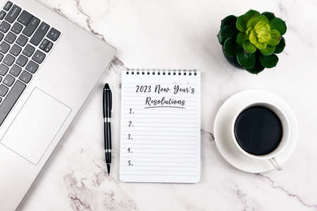 New Year's Resolutions 2023 text on note pad with computer keyboard, potted plant, cup of coffee and pencil