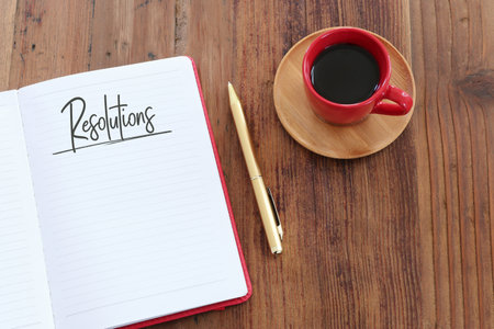 Top view of a cup of coffee,pen and notebook written with New Year Resolutions on wooden background.