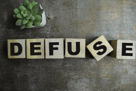 Concept of The wooden Cubes with the word Defuse on wooden background.