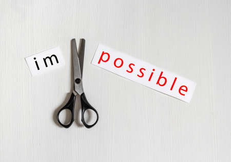 on a light background a hand holds a pair of scissors cuts a piece of paper an inscription is impossible