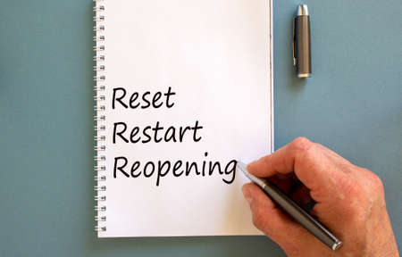 Male hand writing 'reset, restart, reopening' on white note, isolated on blue background.