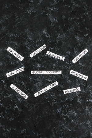 post pandemic economical recession keywords scattered on black background, concept of recovery or recession after the pandemic