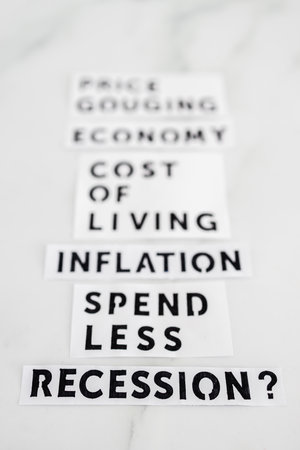 Inflation and recession conceptual image, economic terms on marble desk fading away from the camera