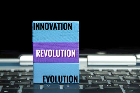 Colored blocks with the words innovation, revolution and evolution