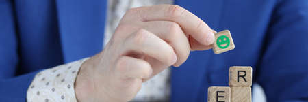 FILO first in last out symbol. Concept words FILO first in last out on wooden blocks. Beautiful blue table blue background. Businessman hand. Business FILO first in last out concept. Copy space.