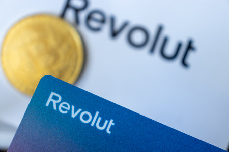 Warsaw Poland - February 18, 2023: Bitcoin and Revolut card logo. Crypto business. banking concept