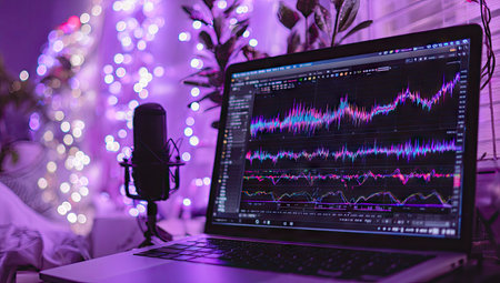 This image showcases a modern digital data visualization environment, featuring colorful graphs on multiple screens, reflecting trends, patterns, and coding interfaces.