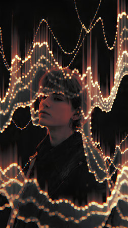 Pulsating neon light overlays create dynamic patterns against a dark background