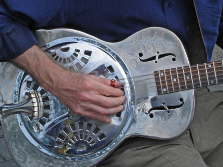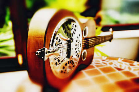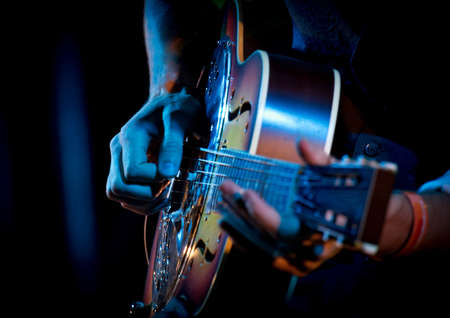 Dobro guitar with hands while playing in live concert, blue, brown colors