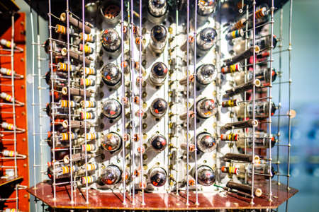 Electronic vacuum tubes close-up. Old electronic Amplifier components.