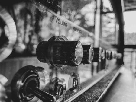 Volume wheel on an old and vintage analog radio. Creative processing for retro looks. Selective focus.