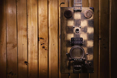 Electric guitar close up. Volume knob. Musical instrument details. Concert color contrast lighting. Six-string guitar during performance. Bright colors on dark background. Cinematic light. Copy space