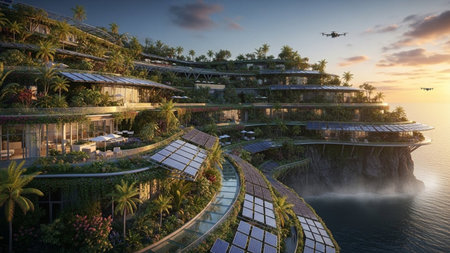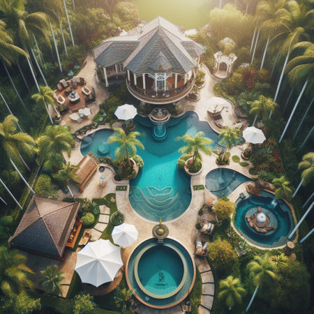 the luxury resort, captured in an aerial view, showcases a stunning landscape adorned with an abundance of palm trees. the composition of the photo is reminiscent of hyperrealistic art, drawing inspiration from renowned artists like beeple. the image features a beautiful color palette of bronze and aquamarine, enhanced through darktable processing. the intricate foliage is a testament to the influence of desertwave and the dusseldorf