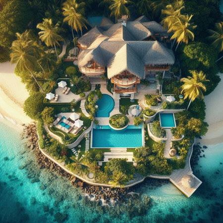 Generative AI : Aerial view of bungalows of a luxury hotel on Huvafen Fushi island on Maldives archipelagos