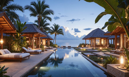 An inviting scene features a resort pool extending towards the ocean under a twilight sky. Palm trees frame the composition, with soft lighting illuminating the buildings and surroundings. The image displays a sense of relaxation and could be suitable for travel, tourism, or lifestyle content.