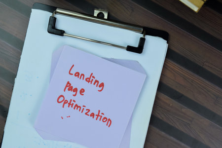 Concept of Landing Page Optimization write on sticky notes isolated on Wooden Table.