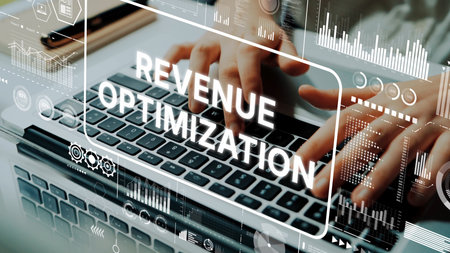 Revenue Optimization Concept with Digital Interface and Hands Typing on Laptop Keyboard. Asymptotic smart data analytic.