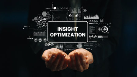 Hands Holding Digital Display of Insight Optimization and Data Analytics Visualization in Business Environment. Asymptotic smart data analytic.